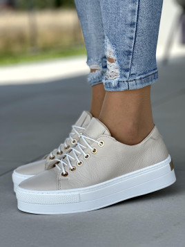 Wnętrze buta, w pełni wykonane ze skóry naturalnej, gwarantuje doskonały komfort noszenia przez cały dzień, dbając o odpowiednią wentylację stopy. Gruba, biała podeszwa nie tylko świetnie kontrastuje z beżowym kolorem cholewki, ale również zapewnia doskonałą amortyzację i stabilność na każdym kroku.