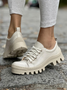 Beżowe trapery wyróżniają się solidną, grubą podeszwą o głębokim bieżniku, która gwarantuje doskonałą przyczepność, niezależnie od warunków pogodowych. Niskoprofilowa cholewka i subtelne sznurowanie sprawiają, że te buty są jednocześnie modne i niezwykle praktyczne. Świetnie komponują się z codziennymi stylizacjami, dodając im nieco surowego, outdoorowego charakteru.