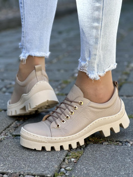 Cholewka butów została wykonana z wysokiej jakości, miękkiej skóry naturalnej w subtelnym odcieniu beżu. Złote detale, takie jak oczka na sznurówki, dodają butom odrobinę luksusu i elegancji, podkreślając ich wyjątkowy charakter. Solidna konstrukcja butów zapewnia nie tylko stylowy wygląd, ale także trwałość na długie lata.