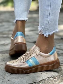 Piękne trampki damskie skórzane marki OLEKSY to kwintesencja stylu i komfortu. Wykonane z wysokiej jakości skóry w pięknym metalicznym miedzianym kolorze z dodatkiem metalicznego niebieskiego, te trampki to doskonały wybór na wiosnę i lato 2024.