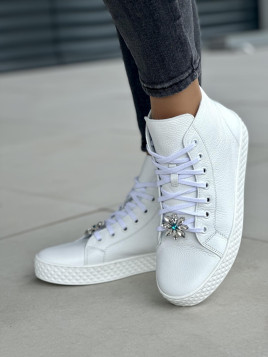Co wyróżnia te trampki? Ozdobne, biżuteryjne aplikacje na przodzie butów dodają im unikalnego, kobiecego akcentu, który przyciąga wzrok. To idealne obuwie dla kobiet ceniących połączenie oryginalności i wygody. Dzięki wysokiej cholewce oraz solidnemu sznurowaniu, trampki doskonale trzymają się na stopie, zapewniając stabilność podczas chodzenia.