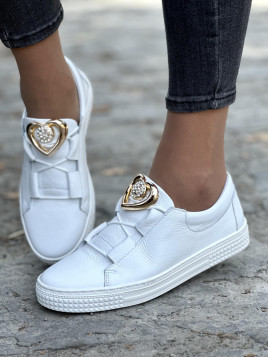 Te eleganckie trampki marki OLEKSY to idealny wybór dla kobiet ceniących sobie połączenie stylu, wygody i jakości. Wykonane w całości ze skóry naturalnej, zarówno wewnątrz, jak i na zewnątrz, gwarantują nie tylko wyjątkowy komfort, ale także trwałość i doskonałe dopasowanie do stopy. Efektowna, złota ozdoba w kształcie serca z delikatnymi błyszczącymi detalami dodaje butom luksusowego charakteru, czyniąc je wyjątkowym elementem każdej stylizacji.