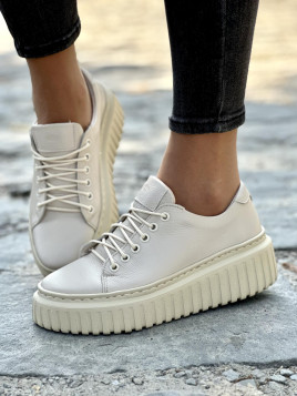 Model ten charakteryzuje się subtelnym, beżowym kolorem oraz nowoczesnym designem, podkreślonym przez grubą, żłobioną podeszwę, która nie tylko dodaje charakteru, ale także zapewnia doskonałą amortyzację. Trampki te są idealnym wyborem dla osób, które cenią sobie modny wygląd połączony z funkcjonalnością.