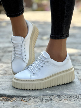 Model ten wyróżnia się masywną, beżową podeszwą, która nadaje trampkom nowoczesnego charakteru i jednocześnie zapewnia doskonałą amortyzację. Biała, naturalna skóra doskonale komponuje się z kontrastującą podeszwą, tworząc harmonijną całość, która przyciąga wzrok. Te trampki to doskonały wybór dla osób, które cenią sobie oryginalność i modny wygląd.