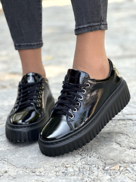Te czarne trampki to idealne połączenie elegancji i nowoczesności. Ich lśniąca powierzchnia dodaje charakteru i sprawia, że buty doskonale sprawdzą się zarówno w codziennych stylizacjach, jak i w bardziej wyrazistych zestawieniach na wieczorne wyjścia. Gruba, czarna podeszwa nie tylko podkreśla nowoczesny design, ale również zapewnia wygodę i doskonałą amortyzację na każdym kroku.