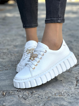 Model wyróżnia się masywną, podwyższoną podeszwą, która dodaje butom charakteru i zapewnia doskonałą stabilność. Dodatkowo złote detale, takie jak ozdobne oczka i biżuteryjny motyw w postaci motyla, nadają trampkom luksusowego i modnego wyglądu. Skóra naturalna gwarantuje trwałość oraz idealne dopasowanie do stopy, dzięki czemu trampki są niezwykle wygodne nawet przy długotrwałym noszeniu.