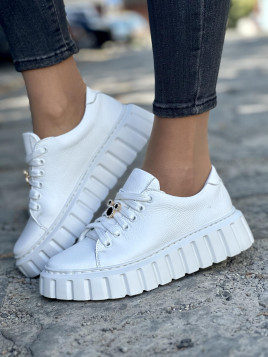 Te wyjątkowe trampki od marki OLEKSY, wykonane z najwyższej jakości naturalnej skóry zarówno wewnątrz, jak i na zewnątrz, to doskonały wybór dla osób ceniących styl i wygodę. Śnieżnobiała, gładka skóra nadaje im elegancji, a delikatna ozdoba na sznurowadłach dodaje subtelnego uroku. Gruba, profilowana podeszwa zapewnia wygodę podczas noszenia i dodaje kilka centymetrów wzrostu, jednocześnie gwarantując stabilność. Dzięki solidnemu wykonaniu i polskiej produkcji, te trampki cechują się trwałością i doskonałym dopasowaniem do stopy. Idealne do codziennych stylizacji, wnoszą sportową elegancję do każdej garderoby.