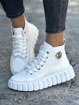 Te białe trampki wyróżniają się minimalistycznym, a zarazem eleganckim designem, który uzupełnia złoty, ozdobny emblemat na boku buta. Ten subtelny detal dodaje całości wyjątkowego charakteru, sprawiając, że buty doskonale sprawdzą się zarówno w codziennych, jak i bardziej eleganckich stylizacjach. Gruba podeszwa zapewnia doskonałą amortyzację, a miękka wyściółka ze skóry naturalnej gwarantuje wygodę na najwyższym poziomie.
