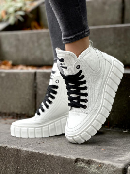 Model wyróżnia się nowoczesnym designem z masywną, podwyższoną podeszwą, która nie tylko dodaje modnego charakteru, ale także zapewnia doskonałą stabilność i wygodę. Czarne sznurowadła kontrastują z białą skórą, nadając butom oryginalności. Trampki doskonale sprawdzą się w każdej casualowej stylizacji, dodając jej sportowej elegancji i charakteru.