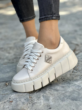 Trampki te wyróżniają się charakterystyczną, podwyższoną podeszwą o futurystycznym wyglądzie, która nie tylko dodaje stylu, ale również zapewnia wygodę i stabilność podczas chodzenia. Delikatny, jasny kolor oraz eleganckie złote detale w postaci oczek i subtelnego logo „Strong” podkreślają unikalny charakter tego modelu. Skóra naturalna zapewnia doskonałe dopasowanie do stopy, co sprawia, że buty są wygodne nawet przy długim noszeniu.