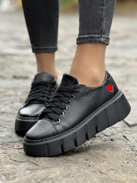 Te czarne trampki wyróżniają się nowoczesnym designem z podwyższoną, masywną podeszwą, która zapewnia nie tylko komfort, ale także modny, odważny wygląd. Dodatkowy akcent w postaci czerwonego serduszka na boku buta nadaje im wyjątkowego charakteru i subtelnego uroku. To doskonały wybór do casualowych stylizacji, zapewniając wygodę i oryginalny styl w każdej sytuacji.