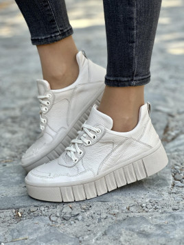 Model wyróżnia się podwyższoną, solidną podeszwą, która zapewnia stabilność i wygodę podczas chodzenia. Miękka skóra naturalna doskonale dopasowuje się do stopy, zapewniając wygodę nawet przy długim noszeniu. Neutralny, jasny kolor sprawia, że trampki te będą pasować do każdej stylizacji, dodając jej nowoczesnego i świeżego charakteru.