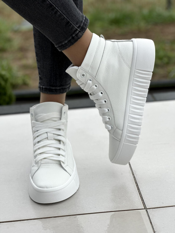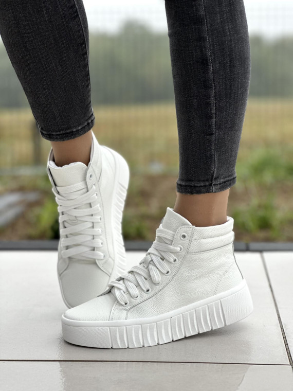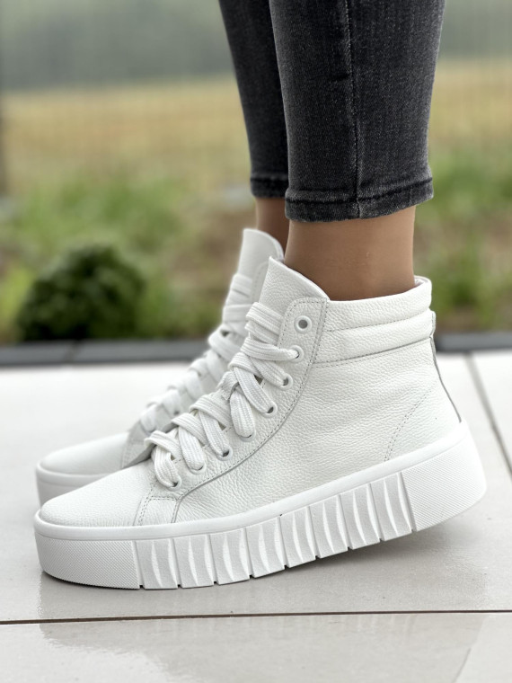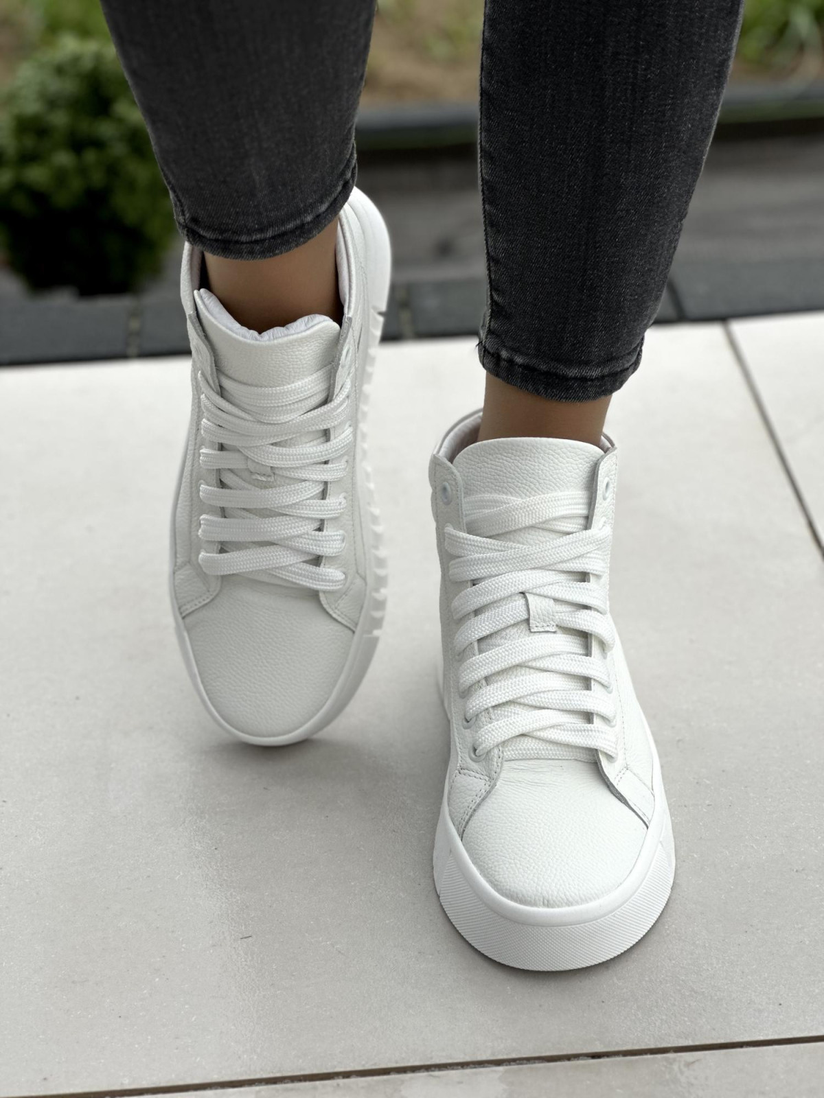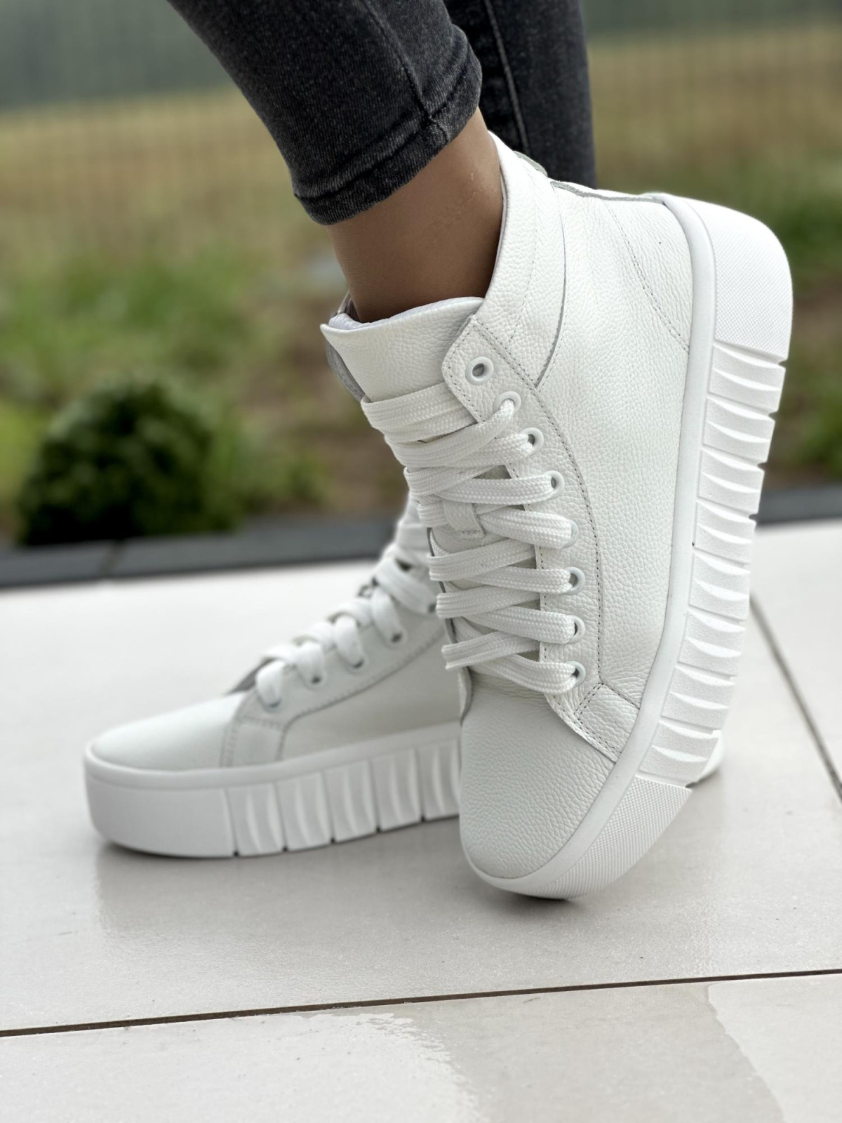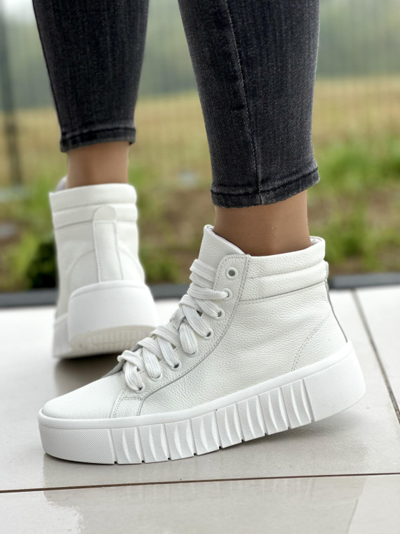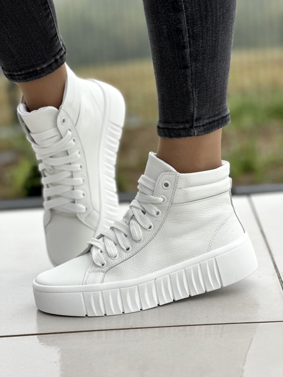 Wysoka cholewka dodaje butom charakteru i stabilności, a ich minimalistyczny, biały design sprawia, że doskonale komponują się z każdą stylizacją – od casualowej po bardziej sportową. Gruba, żłobiona podeszwa zapewnia doskonałą przyczepność i amortyzację, co czyni te buty idealnym wyborem na co dzień.