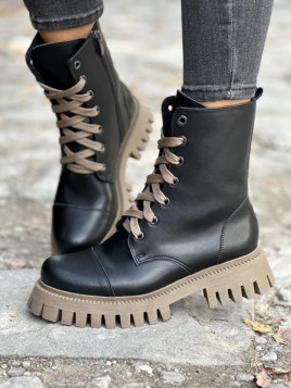 Czarne wykończenie cholewki w połączeniu z masywną, beżową podeszwą tworzy nowoczesny kontrast, który dodaje charakteru każdej stylizacji. Gruba, solidna podeszwa z bieżnikiem zapewnia świetną przyczepność, a wyższa cholewka oraz ciepłe sznurówki gwarantują komfort termiczny i stabilność podczas chodzenia. Dodatkowo boczny suwak ułatwia zakładanie i zdejmowanie butów, co jest dużym atutem dla osób ceniących wygodę.