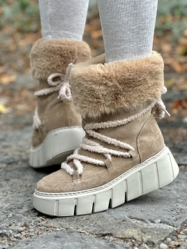 Model ten wyróżnia się miękkim, futrzanym wykończeniem, które nie tylko podkreśla modny wygląd, ale także zapewnia dodatkowe ocieplenie w chłodne dni. Solidna, gruba podeszwa gwarantuje doskonałą przyczepność na śliskich powierzchniach, a szerokie, futrzane sznurówki dodają całości wyjątkowego charakteru. Beżowa kolorystyka śniegowców sprawia, że są one niezwykle uniwersalne i doskonale wpisują się w zimowe stylizacje.