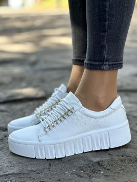 Oto eleganckie trampki marki OLEKSY, wykonane z naturalnej skóry zarówno na zewnątrz, jak i wewnątrz, co gwarantuje doskonałą jakość oraz wyjątkowy komfort noszenia. Te białe, minimalistyczne buty to połączenie nowoczesnego designu z klasycznym stylem, który pasuje do wielu codziennych stylizacji. Masywna, wyrazista podeszwa oraz złote akcenty przy sznurowadłach dodają butom wyjątkowego charakteru.