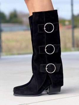 Marzysz o butach, które sprawią, że poczujesz się jak ikona stylu? Butach, które nie tylko przyciągną spojrzenia, ale również dadzą Ci pewność siebie i wygodę na najwyższym poziomie? Te wyjątkowe kowbojki są stworzone właśnie dla Ciebie! Spójrz tylko na ten charakterystyczny design, głęboką czerń i subtelne, a zarazem wyraziste detale – duże, metalowe klamry. To buty, które mówią same za siebie. Elegancja, odwaga i ponadczasowy styl zamknięty w jednej parze.