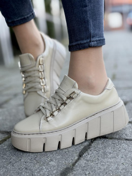 Styl? Te sneakersy to perfekcyjne połączenie elegancji i miejskiego luzu. Beżowy odcień pasuje do wszystkiego – od ulubionych dżinsów po bardziej eleganckie stylizacje. Delikatny połysk skóry i złote detale na sznurówkach przyciągną wzrok i dodadzą Twoim krokom pewności siebie.