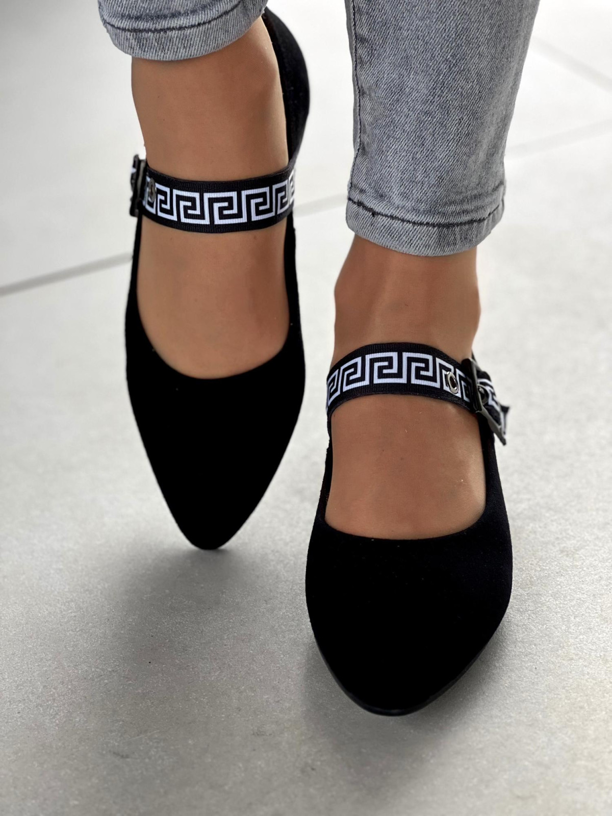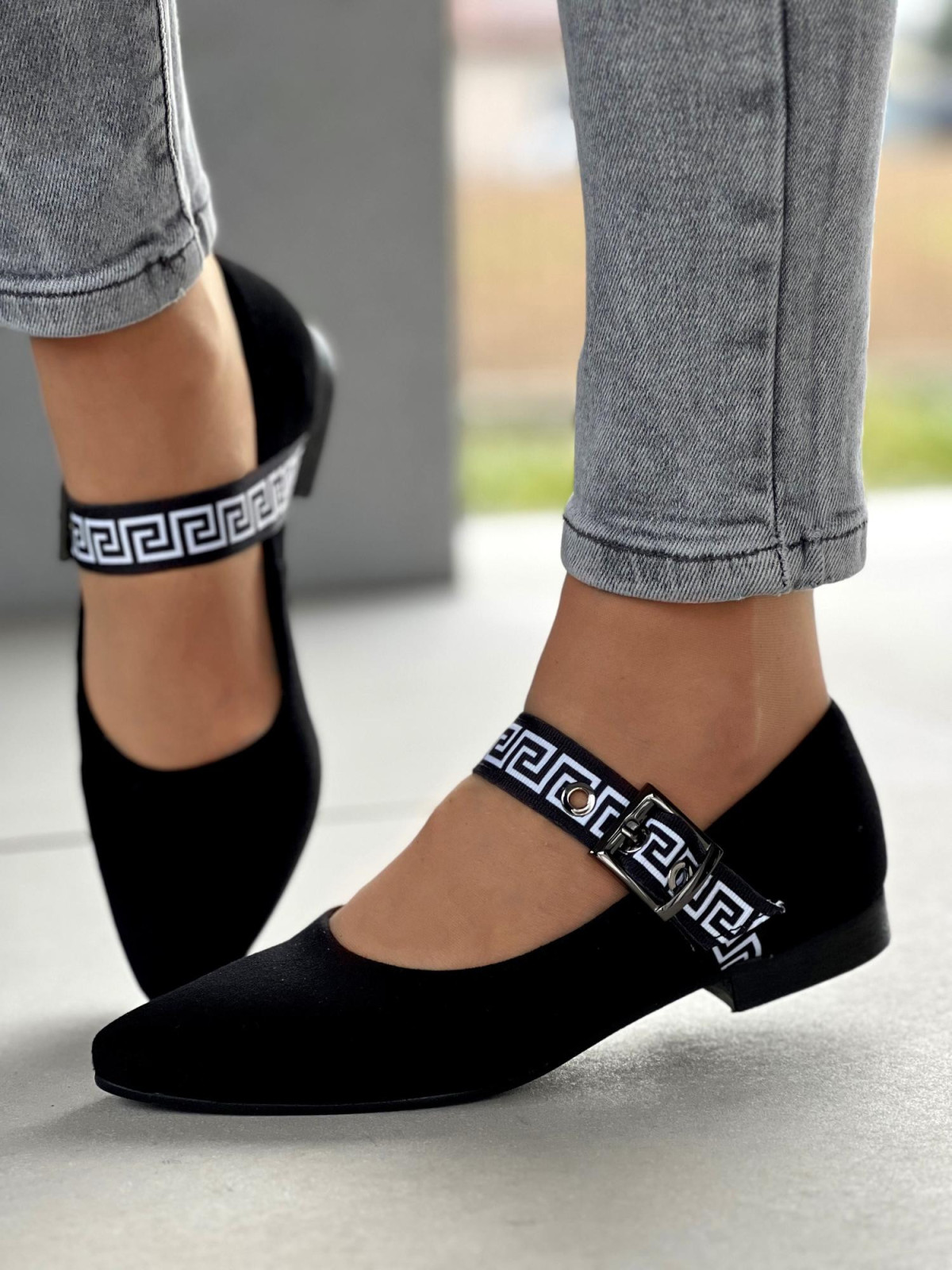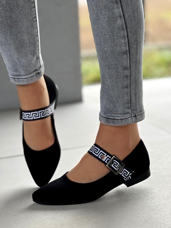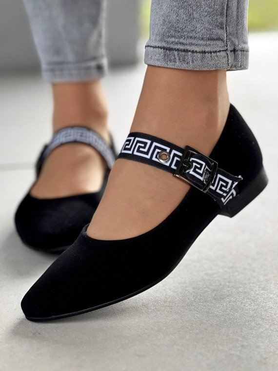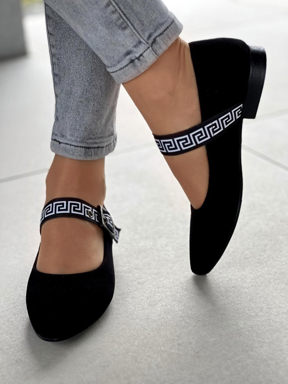 Klasyczna czerń? Tak. Ale z odrobiną nowoczesnego akcentu – ozdobnym paskiem z greckim wzorem i klamrą, który dodaje szyku i sprawia, że te baleriny nie są zwykłym, nudnym obuwiem. To detal, który robi różnicę.