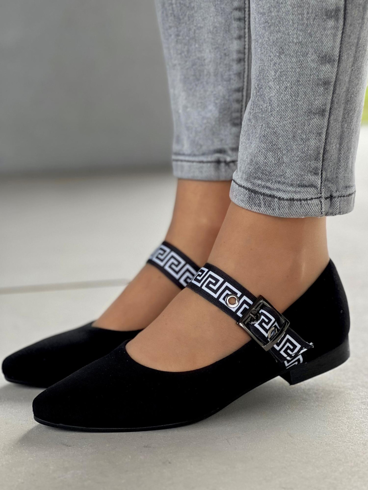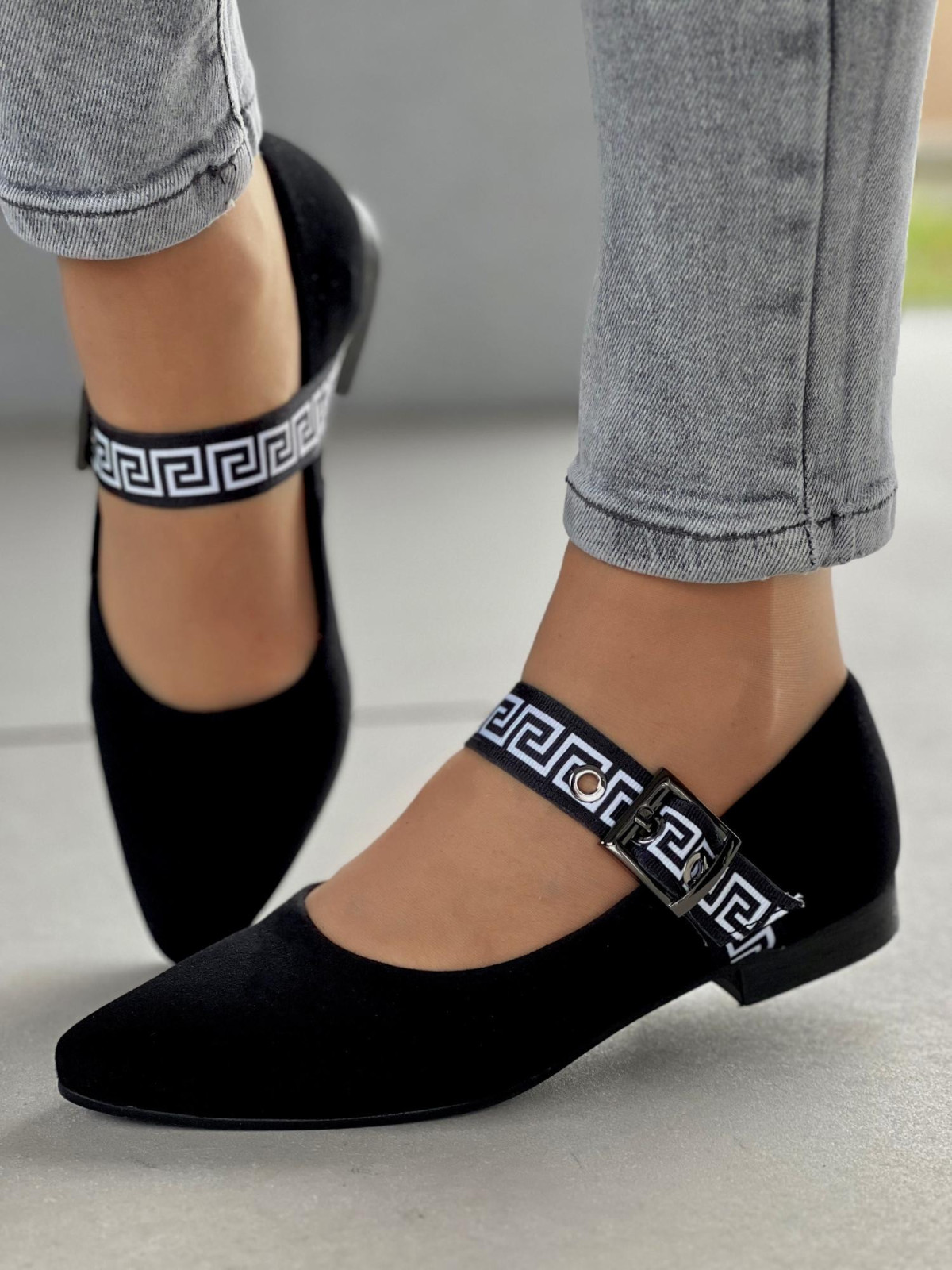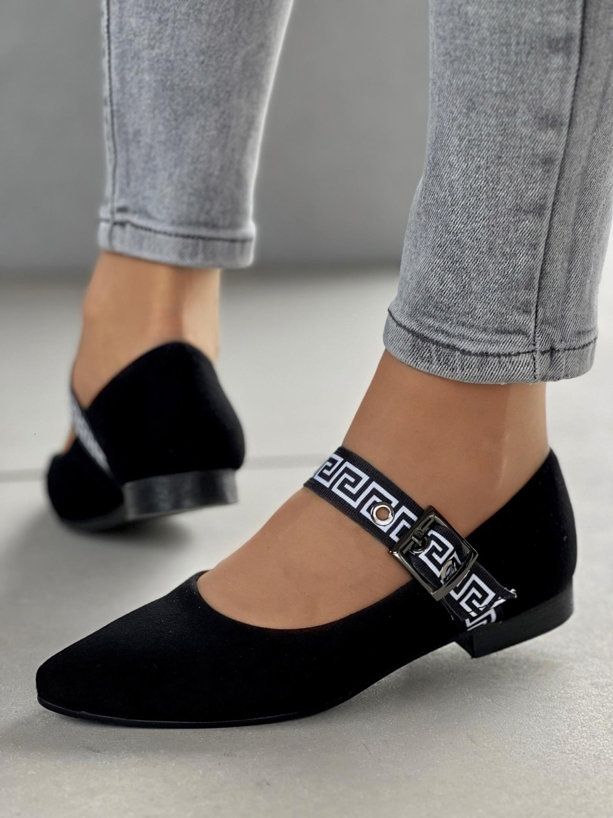 Klasyczna czerń? Tak. Ale z odrobiną nowoczesnego akcentu – ozdobnym paskiem z greckim wzorem i klamrą, który dodaje szyku i sprawia, że te baleriny nie są zwykłym, nudnym obuwiem. To detal, który robi różnicę.