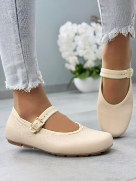 Beżowe baleriny typu Mary Jane marki OLEKSY wykonane zostały z naturalnej skóry, zarówno na zewnątrz, jak i wewnątrz obuwia. Gładka cholewka o delikatnej fakturze nadaje całości estetyczny, schludny wygląd, a klasyczny pasek z metalową klamrą stabilizuje stopę i pełni jednocześnie funkcję dekoracyjną. Niska, płaska podeszwa w naturalnym odcieniu podkreśla lekki charakter modelu.
