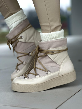Beżowe ciepłe śniegowce damskie ze skóry naturalnej z ozdobnym wiązaniem