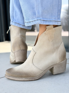 Damskie kowbojki marki OLEKSY wykonane zostały z naturalnej skóry o delikatnie matowym, zamszowym wykończeniu, widocznym na całej cholewce. Prosta forma z subtelnymi przeszyciami podkreśla staranne wykonanie, a boczne wycięcia ułatwiają zakładanie i nadają całości lekkości. Wnętrze obuwia również wykończono skórą naturalną, co podnosi komfort użytkowania.