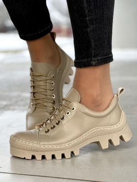 Delikatny beżowy kolor nadaje butom uniwersalności, co sprawia, że są one łatwo dopasowywane do różnych stylizacji. Sznurowane zapięcie pozwala na precyzyjne dopasowanie do stopy, zapewniając jednocześnie stabilność i komfort noszenia.