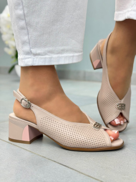 Beżowe sandały damskie zostały wykonane ze skóry naturalnej. Cholewka posiada drobną perforację, która nadaje lekkości i subtelnie podkreśla fakturę materiału. Model ma odkryte palce oraz regulowany pasek z metalową sprzączką wokół pięty. Stabilny obcas typu słupek w kontrastowym wykończeniu nadaje całości nowoczesnego charakteru.