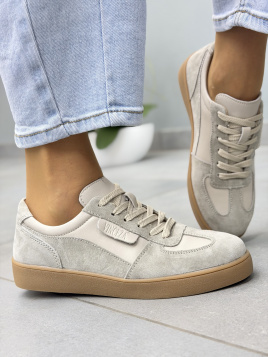 Beżowe sneakersy damskie zostały wykonane w całości ze skóry naturalnej. Cholewka łączy gładką skórę licową z elementami zamszowymi, co tworzy subtelny kontrast faktur i podkreśla staranność wykończenia. Model jest sznurowany, z klasycznym językiem i starannymi przeszyciami. Całość osadzona została na płaskiej, gumowej podeszwie w karmelowym odcieniu. Obuwie wyprodukowane w Polsce.