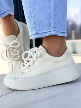 Sneakersy damskie marki OLEKSY wykonane zostały z gładkiej skóry naturalnej, widocznej zarówno na cholewce, jak i wewnątrz obuwia. Skóra ma delikatną, naturalną fakturę, a staranne przeszycia podkreślają solidne wykonanie. Klasyczne sznurowanie pozwala na dobre dopasowanie buta do stopy, a miękka linia cholewki nadaje całości lekki, nowoczesny charakter.