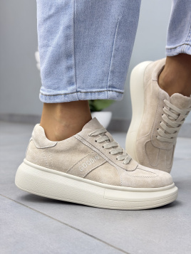 Beżowe sneakersy damskie zostały wykonane z naturalnej skóry. Cholewka o miękkiej, zamszowej strukturze prezentuje się subtelnie i elegancko, a klasyczne sznurowanie pozwala na precyzyjne dopasowanie do stopy. Gruba, jasna podeszwa o jednolitej kolorystyce harmonijnie współgra z całością projektu, tworząc nowoczesną, spójną formę. Model został wyprodukowany z dbałością o detale i staranne wykończenie.
