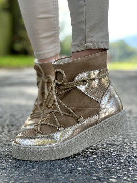 Śniegowce w beżowo-złotym kolorze prezentują się elegancko i stylowo. Beżowa baza jest uniwersalna, podczas gdy złote elementy dodają butom wyjątkowego uroku.