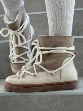 Te ciepłe beżowe śniegowce OLEKSY zostały wykonane z naturalnej skóry licowej oraz zamszu, które tworzą spójną i estetyczną całość. Cholewka łączy gładką skórę z miękkim zamszowym wykończeniem w górnej części, a całość uzupełniają jasne, tekstylne sznurowania oplatające kostkę. Solidna, płaska podeszwa w brązowym odcieniu podkreśla codzienny charakter obuwia i zapewnia stabilne podparcie.