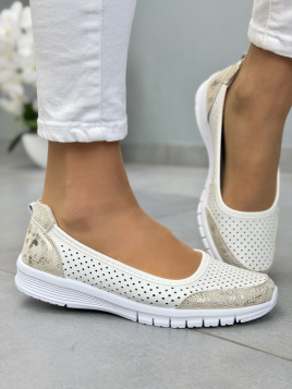 Baleriny zostały wykonane z naturalnej skóry. Cholewka w kolorze białym posiada delikatną perforację, która nadaje lekkości i zapewnia przewiewność. Kontrastowe wstawki w odcieniu beżowo-złotym na nosku i zapiętku subtelnie podkreślają linię buta. Elastyczna, jasna podeszwa z wyraźnymi nacięciami wspiera naturalny ruch stopy podczas chodzenia. Model produkowany z dbałością o detale i staranne wykończenie.