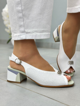 Białe sandały damskie zostały wykonane w całości ze skóry naturalnej. Cholewka o zabudowanym przodzie posiada delikatną perforację, która nadaje lekkości i subtelnie podkreśla strukturę materiału. Model osadzono na stabilnym obcasie typu słupek w kontrastującym, geometrycznym wykończeniu. Z tyłu zastosowano pasek z regulowaną sprzączką, umożliwiający dopasowanie do stopy.