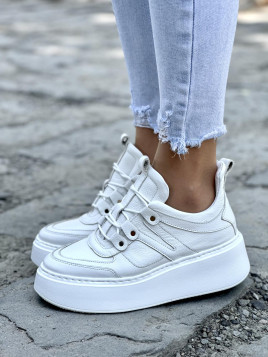 Białe sneakersy damskie skórzane OLEKSY to absolutny hit polskiej produkcji na sezon wiosna-lato 2024. Wykonane z wysokiej jakości skóry naturalnej, gwarantują trwałość i komfort noszenia. Ich charakterystyczna cechą jest gruba podeszwa, która nadaje im sportowego, ale jednocześnie eleganckiego wyglądu.