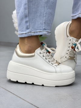 Białe sneakersy damskie zostały wykonane ze skóry naturalnej. Gładka cholewka o minimalistycznym wykończeniu została uzupełniona kontrastującym, metalicznym zapiętkiem w odcieniu jasnego złota. Model jest sznurowany, z klasycznym układem oczek oraz dekoracyjnymi koralikami przy sznurówkach. Całość osadzona została na wyrazistej, grubej platformie z bieżnikiem.