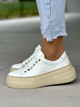Białe trampki damskie skórzane na beżowej podeszwie marki OLEKSY to eleganckie i stylowe obuwie, które idealnie sprawdzi się na co dzień. Wykonane z wysokiej jakości skóry naturalnej, gwarantują trwałość i komfort podczas noszenia. Ich uniwersalny kolor sprawia, że będą świetnie pasować do różnorodnych stylizacji, dodając im świeżości i lekkości. Podeszwa w beżowym odcieniu dodaje całości elegancji i sprawia, że trampki wyglądają bardzo nowocześnie. Polska produkcja gwarantuje wysoką jakość wykonania i dbałość o szczegóły. To obuwie, które z pewnością spełni oczekiwania każdej kobiety ceniącej sobie wygodę i modny wygląd.