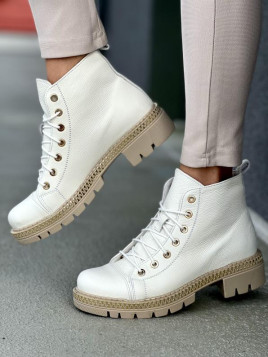 Białe trapery damskie skórzane z zewnątrz wykonane są ze skóry naturalnej licowej, a w środku wypełniony ociepleniem, które zapewni Ci ciepło w jesienne i zimowe dni.