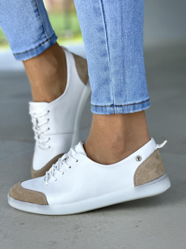 Biało-beżowe trampki wykonane ze skóry naturalnej to doskonały wybór na letnie dni. Ich miękka struktura zapewnia wygodę i komfort noszenia, a jednocześnie są bardzo trwałe i odporne na uszkodzenia. Klasyczny kolor biało-beżowy sprawia, że są uniwersalne i pasują do wielu stylizacji.