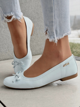 Te baleriny w odcieniu jasnego błękitu wykonane są z naturalnej skóry – zarówno na zewnątrz, jak i wewnątrz. Gładka cholewka, staranne przeszycia oraz delikatna kokardka z przodu podkreślają dopracowane wykończenie. Niska, płaska podeszwa w ciepłym odcieniu brązu tworzy spójną, estetyczną całość.