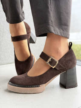 Czółenka marki OLEKSY wykonane z naturalnej skóry zamszowej w głębokim, brązowym odcieniu. Cholewka ma klasyczny, zaokrąglony nosek oraz pasek z regulowaną klamrą w kolorze złota, który stabilizuje stopę i podkreśla elegancki charakter obuwia. Wnętrze oraz zewnętrzna część wykonane są z naturalnej skóry. Model osadzony na solidnym słupku oraz grubszej, kontrastowej platformie z widocznym przeszyciem.