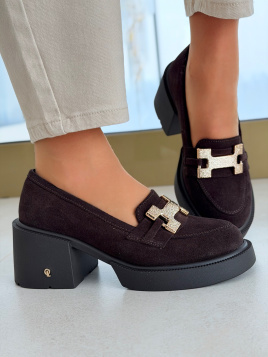 Eleganckie mokasyny marki OLEKSY wykonane z naturalnej skóry zamszowej po zewnętrznej stronie oraz skóry naturalnej wewnątrz buta. Starannie wyprofilowana cholewka o klasycznej linii została uzupełniona dekoracyjną metalową klamrą w złotym kolorze, która nadaje całości wyrafinowany charakter. Stabilna podeszwa z wyraźnym obcasem typu słupek zapewnia solidne podparcie i estetyczne wykończenie.