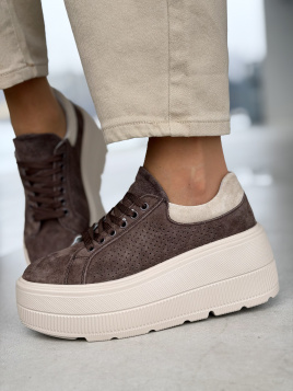 Sneakersy wykonane z naturalnej skóry zamszowej w odcieniu głębokiego brązu. Cholewka posiada perforowane panele boczne, które nadają lekkości wizualnej i podkreślają nowoczesny charakter modelu. Wnętrze oraz zewnętrzna część obuwia wykonane są ze skóry naturalnej. Kontrastowy jasny panel przy pięcie oraz klasyczne sznurowanie tworzą spójną i estetyczną całość. Buty osadzone są na grubej, jasnej platformie z wyraźną fakturą.