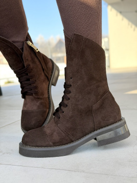 Te brązowe botki damskie zostały wykonane z naturalnej skóry zamszowej, która nadaje obuwiu miękki, matowy wygląd i podkreśla jego klasyczny charakter. Cholewka sięga ponad kostkę, a staranne przeszycia podkreślają solidne wykonanie. Wnętrze butów również wykończono skórą naturalną. Model posiada sznurowanie oraz boczny zamek, co ułatwia zakładanie i dopasowanie do stopy.
