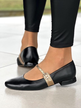 Czarne baleriny damskie skórzane ze złotym paskiem