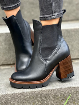 Cechą charakterystyczną tego modelu jest stabilny, szeroki obcas, który nie tylko optycznie wysmukla sylwetkę, ale także zapewnia wygodę przez cały dzień. Gruba, profilowana podeszwa gwarantuje doskonałą przyczepność, a elastyczne wstawki po bokach ułatwiają zakładanie butów i zwiększają komfort użytkowania. Klasyczny, czarny kolor w połączeniu z brązowym akcentem na podeszwie dodaje butom wyrazistości, czyniąc je idealnym dodatkiem do jesienno-zimowych stylizacji.