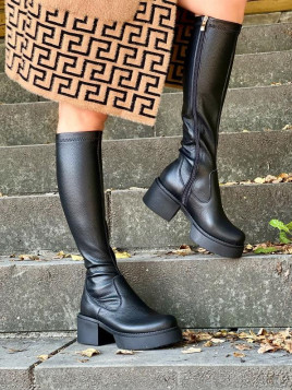 Czarne kozaki damskie skórzane wykonane są z lycry w połączeniu z naturalną skórą licową, a w środku wypełniony ociepleniem, które zapewni Ci ciepło w jesienne i zimowe dni.