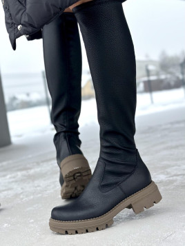 Czarne kozaki damskie połączenie lycry i skóry naturalnej na traperkowej podeszwie